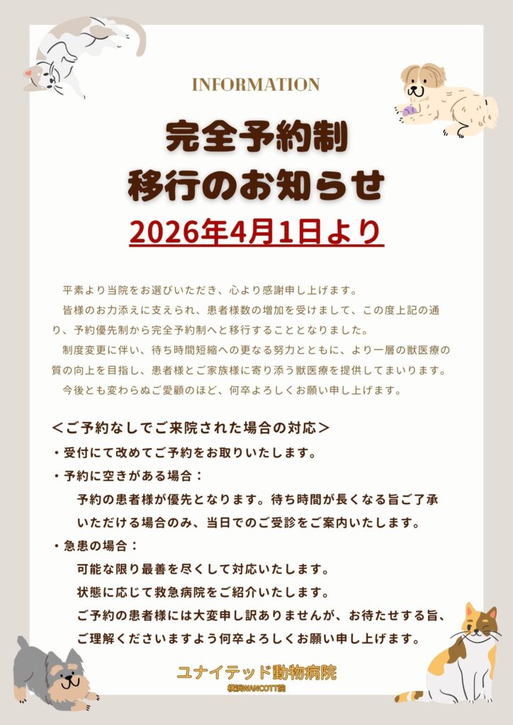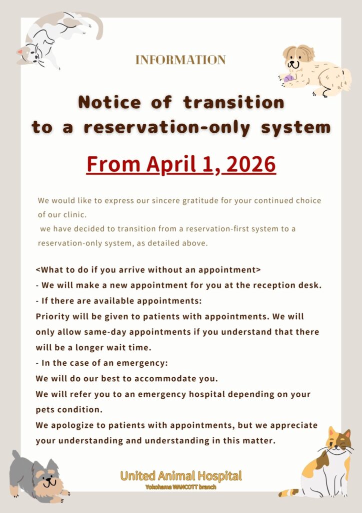 質の高い獣医療を提供し続けること、またご予約いただいた患者様をできる限りお待たせしないようにするため、この度の決定となりました。